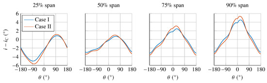 Circumferential variations of changes in the incidence angle relative to operation in the uniform flow at the propulsor inlet at various span fractions. Flow stagnates on the blade pressure surface with a positive incidence angle i.