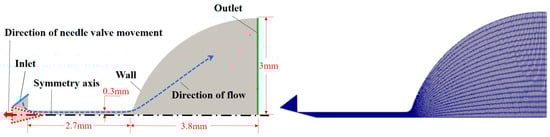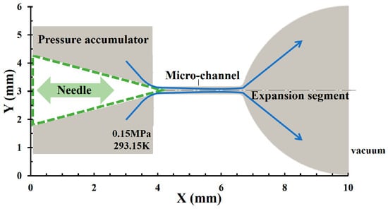 The computational domain of the micro-thruster is shown in Figure 3. The computational domain model can be divided into four sections such as inlet section, throat, micro-scale channel, and nozzle expansion section. Since the nozzle is an axisymmetric structure, a wedge-shaped computational domain, circumferential angle set to 0.5°, is used in this study. The main structural parameters of the micro-nozzle include the following: (1) valve needle cone angle is 30°; (2) micro-flow channel inner diameter of 0.6 mm, length of 2.7 mm, i.e., the length–diameter ratio is 4.5; (3) the expansion section length of 3.8 mm, outlet diameter of 6 mm. Since the DSMC calculation is applied to the whole area, the continuous flow area in the valve cavity upstream of the throat needs to be minimized in order to reduce the calculation effort, so the area within 0.4 mm upstream of the throat is selected for this calculation. Before the formal calculation, dsmcInitialise is used to set initial conditions such as the temperature of nitrogen molecules and walls, the velocity of the nitrogen molecules, and the number density of molecules at the entrance, and this process took 5 s.