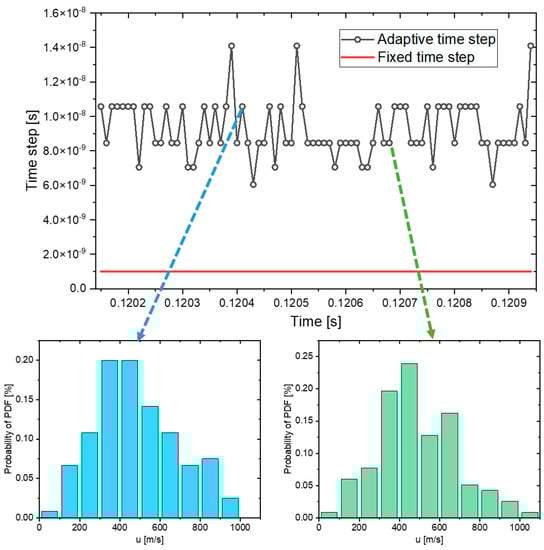 Figure 4 shows the verification of the selected time step during calculation, which compares the time step to the ratio Δx/(3*u0), where Δx is the applied maximum cell size and u0 is the most probable velocity. The following histogram in Figure 4 shows the two velocity distributions in the calculation process, which can calculate u0. The results show that the calculated adaptive time step is always greater than the set fixed time step, so it meets the requirements.