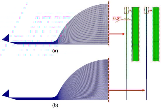 Table 1 lists the different computational domain meshing schemes and the predicted deviation values with respect to the results of Grid 9. In the work on grid independence analysis, the needle valve opening ratio is set to 10%, i.e., the opening displacement 3.4 μm. Based on the comparison results of the gas’s average exit velocity on the outlet face, Grid 5 has a higher computational accuracy (calculation deviation 1.79%) and a relatively small total number of cells. The effect of continuing to increase the number of cells on the calculation results is small, with a relative deviation effect of less than 2%. Figure 5 shows Grid 1 and Grid 9 in Table 1, and the grid at the exit section.