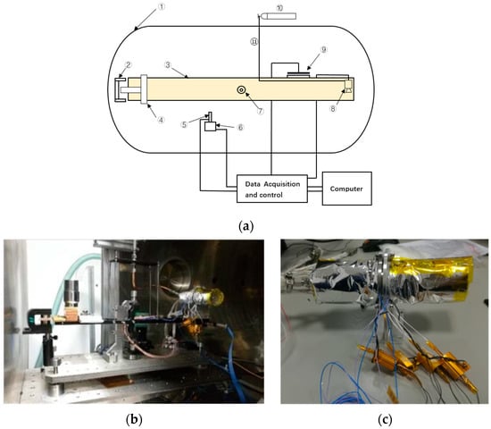 Thrust measurement system. (a) Schematic diagram of measuring system. ① Vacuum Chamber; ② Damper; ③ Pendulum; ④ Counter weight; ⑤ Displacement Device; ⑥ Precision Seat; ⑦ Axis; ⑧ Micro-thruster; ⑨ Calibration System; ⑩ Gas Bottle; ⑪ Pipe. (b) Establishment of thrust measurement system. (c) Thruster with thermal control coating.