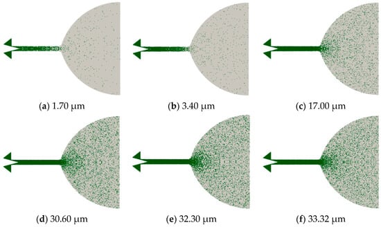 Particle distributions in the axial plane with different needle displacements at t = 0.1 ms. The calculation contours are mirrored on the axis of the symmetry axis.