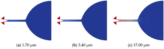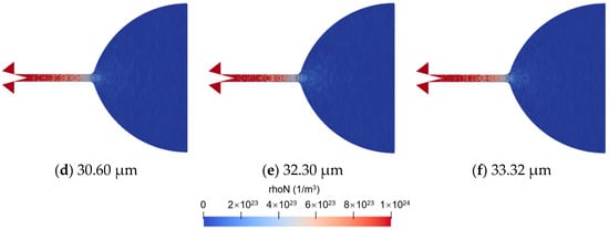 It has been shown that the molecular number density is an important parameter affecting the rarefied flow []. The following sections provide a detailed analysis of the flow characteristics within the micro-nozzle and investigate the flow mechanism under different needle displacements. The distributions of the DSMC molecular particles on the axial section of the micro-nozzle at different needle displacements at 0.1 ms are given in Figure 7. The results show that when the needle displacement is less than 3.4 μm, the nitrogen molecules are mainly concentrated in the upstream volume of the throat and the micro-channel due to the throttling effect. Then the nitrogen molecules quickly fill the entire nozzle space after leaving the micro-channel. As the needle valve displacement increases, the number of nitrogen molecules in the nozzle increases rapidly.