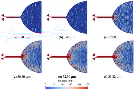 Molecular internal energy fields in the axial plane with different needle displacements at t = 0.1 ms.