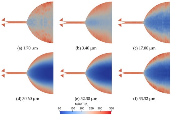 Figure 10 shows the macro temperature field of the gas inside the micro-nozzle. The DSMC calculation results require time-averaged statistics to obtain the macroscopic temperature distribution results. In OpenFOAM, the fieldAverage function object calculates and stores ensemble- or time-based field averages, with optional windowing. It is applicable to all field types, i.e., scalar, vector, tensor, etc. We used 50 DSMC time samples, and the time span across which the average is performed is 2 μs. When the needle valve opening ratio is small, the temperature distribution inside the nozzle is more uniform. With the increase in needle valve displacement, the gas temperature difference between the center and periphery of the nozzle expansion section gradually increased. Obviously, the acceleration of the gas molecules reduces the internal energy in the center of the nozzle expansion. As the needle valve displacement increases to greater than 30.6 μm, the gas temperature in the center of the nozzle drops to about 80 K.
