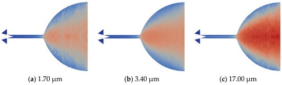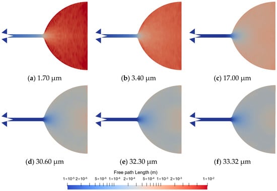 The mean free path length is the average distance that a molecule travels between collisions, which is an important factor influencing the rarefied degree of fluid. It is determined by the criterion that there is one molecule within the collision tube. The mean free path length can be obtained by the following equation []. To better show the results of the local molecular free path length in the nozzle, the legend color is set as the log distribution function (See Figure 12). There is a significant difference between the molecular free path in the micro-channel versus in the nozzle expansion section. The mean free path length in the nozzle expansion section is significantly larger than that in the micro-channel. The free path length of the molecules near the wall of the nozzle expansion section is significantly larger than in the central region. The average molecular free path in the nozzle at needle valve displacements that are less than 3.4 μm is an order of magnitude higher than the value at large needle valve displacements (greater than 17 μm). The smaller the valve opening, the more significant the throttling effect of the throat is, and the smaller the number of molecules entering the micro-channel and nozzle is, thus expanding the average molecular spacing and increasing the molecular free path length.