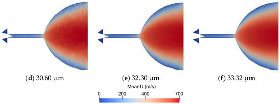 Time-averaged fluid velocity fields in the axial plane with different needle displacements at t = 0.1 ms.