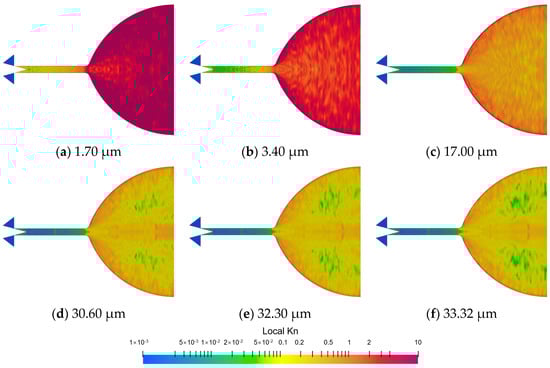 The local value of the Knudsen number (Kn), a dimensionless number defined as the ratio of the molecular mean free path length to a representative physical length scale, determines the degree of rarefaction and the degree of validity of the continuum model in a particular flow. If the Kn number is near or greater than 1.0, the mean free path of a molecule is comparable to a length scale of the problem, and the continuum assumption of fluid mechanics is no longer a good approximation []. The local Knudsen number is defined as Kn = λ/L, where L is expressed as the scale length of the macroscopic gradients, i.e., . The results of the local Kn distribution for different needle valve openings are given in Figure 13. To facilitate the observation of the location of the different values of Kn, ranging from 0.01 to 10 in the contour plot, the legend color takes the form of a logarithmic function. The results show that when the needle valve opening is less than or equal to 10%, i.e., needle displacement of 3.4 μm, the contour line of the local Kn of 0.01 appears in the region near the throat, and a local Kn larger than 0.1 is in the region upstream of the micro-channel. The region between the above two contour lines belongs to the slip flow regime. At all needle valve opening conditions, the no-slip continuous flow marked in blue in Figure 13 is distributed in the valve cavity region upstream of the throat. The gas, filled with dark purple, in the nozzle extension region is in the free molecular flow regime, as the value of the local Kn number is greater than 1 and less than 10. When the needle valve opening ratio exceeds 10%, i.e., the needle displacement is larger than 3.4 μm, the slip continuous flow region occupies almost the entire micro-channel, and the extended nozzle area is in the transition flow state. There is no free molecular flow in the micro-nozzle.