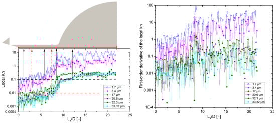 To quantitatively analyze the spatial distribution of the flow regime in the nozzle at different needle valve openings, the local Kn number curves at the nozzle axis are plotted in Figure 14. The horizontal coordinate in the figure is the dimensionless length Lx/D. D is the internal radius of the micro-channel. Lx is the horizontal distance from the valve needle tip. The number of local Kn numbers increases gradually along the nozzle axis toward the outlet boundary. Near the exit of the micro-channel, the rate of increase of the local Kn number is higher than that of other regions. This indicates that the nitrogen molecule expands more rapidly in this region, resulting in an increased mean molecule free path. Combined with the right-side graph, the larger the needle valve opening, the lower the growth rate of the local Kn number (the first order derivative of the local Kn number). As the needle valve opening increases, the partition interface between the slip flow and the transition flow region (Kn = 0.1) then moves down from the approx. 1D position upstream of the micro-channel to the 8D position. In all cases, the flow in the axis of the micronozzle is almost in discontinuous flow only when the needle valve displacement is 1.7 μm. When the needle valve displacement is 3.4 μm, continuous flow develops to 2/3 of the micro-channel length. Continuous flows are developed to the micro-channel outlet with a needle valve displacement greater than 3.4 μm.