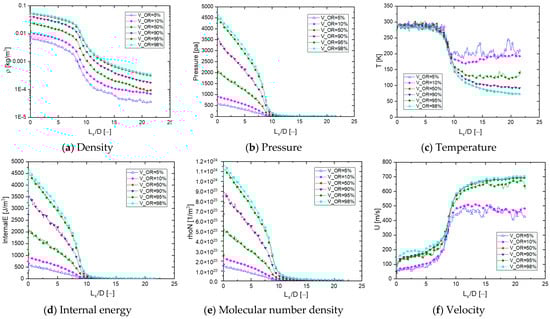 Figure 15 shows the macroscopic flow parameters at the axial position of the micro-thruster for different needle valve opening ratios. As the needle valve opening ratio increases, the gas density, pressure, internal energy, and rhoN (i.e., mean molecular number density) in the micro-thruster gradually increases. After the needle valve opening ratio exceeds 95%, the fluid macro parameters remain stable. There are significant fluctuations in the macroscopic gas temperature and velocity values when the needle valve is opened below 10%. This result may be related to the reduction in the number of statistical molecular particles caused by the rarefied flow. When the needle valve opening ratio is less than 10%, the gas exit velocity at the nozzle axis reaches 400 m/s, while the gas exit velocity increases up to 700 m/s as the needle valve opening ratio increased to 90%.
