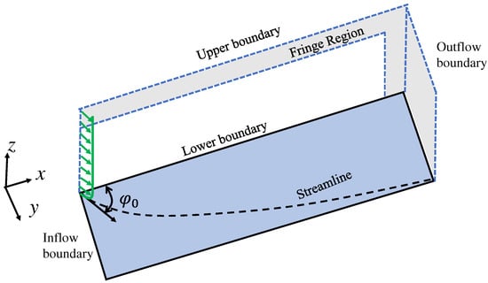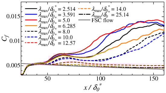 The fractional-step method was used to couple Equations (1) and (2). The time advancement was carried out using the Crank–Nicolson scheme for the wall-normal viscous diffusion term in Equation (2) and by the Adams–Bashforth scheme for the other terms. For the spatial discretization, the finite difference method was used: the 4th-order central scheme in the wall-parallel directions with uniform grids and the 2nd-order central method in the wall-normal direction with non-uniform grids. As an inflow boundary condition at , fluctuations that simulate freestream turbulence with an arbitrarily chosen peak wavelength are applied directly. Details of this initial disturbance are described later. A non-slip condition was applied to the wall surface at , and a periodic boundary condition was imposed in the spanwise direction. The spanwise periodic boundary and uniform grids allowed us to solve the pressure Poisson equation efficiently using a spectral Fourier-based method and to realize a parametric study of highly demanding DNS reported here. Here, the fast Fourier transform (FFT) and the discrete cosine transform (DCT) were employed for y and x, respectively. A convective outflow condition was applied in the chordwise direction. For numerical stability, a fringe region was added at the outflow boundary for the velocity field to asymptotically approach the FSC-similar solution at the edge of the computational domain. This fringe region was also applied at the upper boundary, . The thickness of each fringe region in the chordwise or wall-normal direction was and , respectively. These thicknesses were adjusted to be as small as possible, but not so small as to cause numerical oscillations. The isolated cylindrical roughness element was implemented using the direct-forcing immersed boundary method [35]. The same settings regarding the fringe region and the roughness element were used in our previous report [17], but the diameter and spanwise interval of the roughness cylinder in this study were consistently constant.
