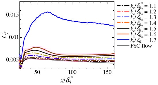 The Reynolds number is defined as , where and are the external chordwise velocities at the inlet and kinematic viscosity, respectively. The values of the parameter set relevant to the FSC solution, where the external chordwise and spanwise velocities are, respectively, and with a local sweep angle of , were identical to those in [10,12,17]. The chordwise computational domain is as long as possible to capture the complete turbulent transition of the laminar flow at the inlet: was used for most cases, but it was extended to for a few cases where the transition was protracted. The number of grids was doubled to keep the resolution constant in the long-domain case. The present reasonable resolution was based on the grid convergence test and was slightly higher than previously reported [17] for the purpose of discussing secondary instabilities on CFV. When scaled in wall units based on the local friction velocity, a uniform grid was used such that the chordwise grid width was , and the same was true for the spanwise grid width. In the wall-normal direction, an unequally spaced grid with at the first grid point near the wall and at the outer edge of the boundary layer was used. These resolutions satisfy the grid requirements for turbulent transitions due to FSTs in a flat-plate boundary layer [36]. Even around the roughness cylinder, unphysical numerical oscillations that could be fatal to the transition mechanism were not detected in the present DNS results. The spanwise domain size was , which corresponds to equally spaced roughness elements at . This interval is the same value as the most unstable wavelength in the FSC similarity solution for the present condition, which promotes efficient growth of the most unstable modes. Such a strategy is commonly used to investigate the turbulent transition process of crossflow instabilities [10,12,17,18]. The numerical conditions are summarized in Table 1.