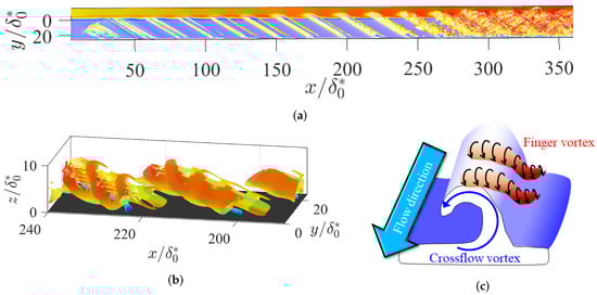 For , the long domain (cf. Table 1) is employed to observe the overall picture of the gradual transition. As seen in Figure 4, the vortex from the wake of the cylindrical roughness forms a CFV and it became turbulent at . Before being turbulent, secondary vortices occur on one side of the CFV: see Figure 4b for a close-up around . The secondary vortex is known as the finger vortex and is caused by the high-frequency secondary instability. The finger vortex covers the side to the top of the CFV, which type is the mode-z (type-) and mode-y (type-) secondary instability [10,15,40]. The finger vortex emerges primarily as the mode-z secondary instability and, as it moves downstream, the vortex reaches to the top of CFV and appears as the mode-y secondary instability. This mechanism is also reported by Casacuberta et al. [41]. The streamwise wavelength of the finger vortex is , which is comparable to previously reported [10] and ≈16 [41], although the latter reference named the finger vortex a ridge-like structure. Note here that streamwise refers to the direction along the CFV. The finger vortex is a peculiar phenomenon to the CFV-dominated flow field, and no observation has been reported in the 2D boundary layer. In the FSC flow without FST, all gradual-transition processes follow the same path: (1) formation and growth of CFV, (2) generation of a finger vortex via high-frequency secondary instability, and (3) turbulent transition. Although not discussed in this study, a smooth surface without roughness exhibits a similar transition process but with traveling CFV [6,22].