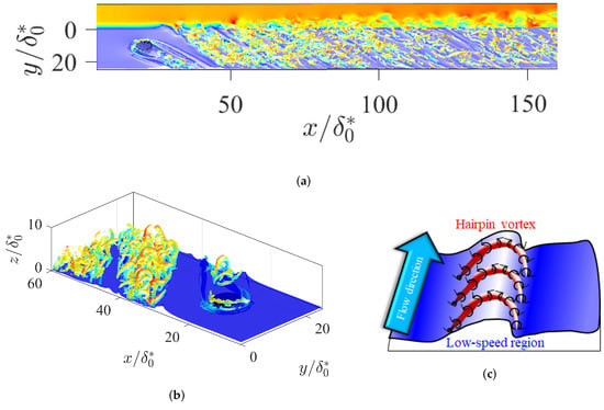 Instantaneous flow field of for . (a,b) Isosurface and color contours are the same as those in Figure 4, but . (c) Schematic of the hairpin vortex on a low-speed streak.