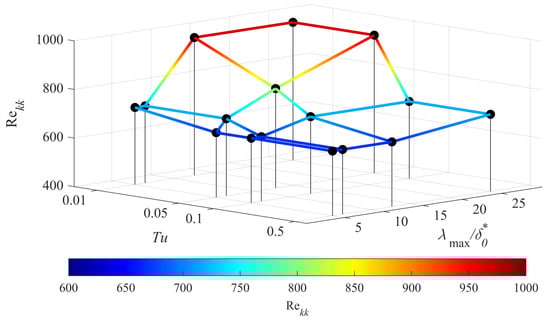 Freestream turbulence represents disturbances in the mean flow of an aircraft flight environment or wind tunnel experiment. When subjected to FST, the CFV in the flow field should be affected by the intensity of FST [23], resulting in the chordwise shift of the turbulent transition point [24,25]. The critical roughness Reynolds number for the immediate transition is –717 when , as reported in Section 3.1, but this will change under the influence of FST with . In the following, we discuss not only the intensity of the FST, but also the effect of their peak wavelengths.