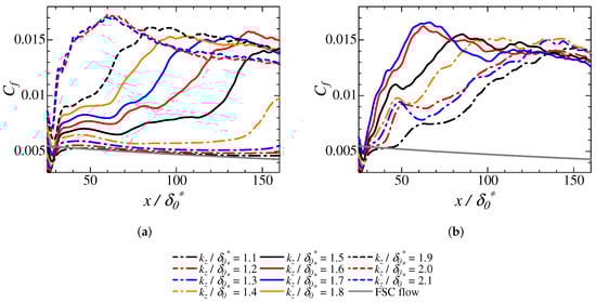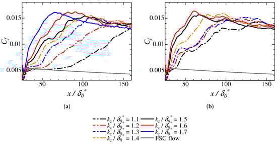 Let us address two parameter sets of and as the cases where increases and decreases, respectively, and discuss the variations in the flow fields depending on the roughness height. The friction coefficients for various are shown in Figure 7. Under all the conditions with roughness height –, the turbulent transition occurs earlier (i.e., more upstream) in the case of short- FST. In particular, even for the lowest , the transition position can be confirmed at , where attains the turbulent value of about 0.014: see (b). Note here that, without FST, the transition does not occur within this domain for . As for the long- condition, the profiles are similar to those without FST for : compare Figure 3 and Figure 7a. A significant deviation from the FSC laminar profile can be identified even at a still-low . As increases, the transition point emerges in and shifts upstream. However, it should be noted that the profile jumping from the laminar to turbulent values is different from that of the immediate transition. The latter profile is steep and slightly convex upward, as in the case of in Figure 7a. In contrast, for –, the profile is gently increasing and convex downward. It may be characterized by a plateau after the deviation from the laminar profile. Such a transition in the distribution is similar to that seen in the natural transition process via CFV, which is seen more downstream than without FST [17]. We interpret these transition processes, observed in Figure 7a, as an ‘early transition’ of CFV due to FST. The mechanisms causing the early transition will be discussed in Section 3.3. As for the threshold of the immediate transition, Figure 7b reveals () under the short- FST condition, implying that the immediate transition process occurs at a low roughness height due to the FST. Even in the case of , the turbulent transition occurs much earlier than under the no-FST condition (). This early transition of CFV due to FST is in agreement with Refs. [24,25]; in other words, they discussed the effects of FST at relatively short wavelengths. Our result also demonstrates that the long- FST results in a downstream shift of the transition position () for (), whereas it is located more upstream at under the no-FST and short- conditions because of the immediate transition for the long- FST with , . This is the highest obtained in our study (with ) and is larger than, though not far off, those reported previously [16,25,43]: for a plot of versus , see Ref. [16]. The benchmark for was reported by von Doenhoff and Braslow [43] and other references [16,25], including various data in the literature. The present minimum (for ) is also on the upper side of the scattered existing data set. This slight deviation is due to differences in how to determine the critical values in the DNS and experiments, as well as the measurement environment including FST. The experimentally obtained are shifted slightly downward compared to DNS because the numerical study can measure the distribution more rigorously. A recent experiment [20] reported with another criterion based on the detection of turbulent transition fronts at a defined location of ( downstream from the cylinder), using a two-dimensional determination based on the difference in heat transfer between laminar and turbulent flows. If the same criterion is employed here, our obtained critical values are revised lower: that is, and for short- and long- FST conditions, respectively. The much lower value of by Zoppini et al. [20] may be due to an early transition caused by short wavelength components of FST. The difference from an early experiment [43] also suggests some dependencies on the FST intensity and wavelength. The following section discusses the FST dependences of both the early transition and the immediate transition.