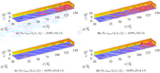We discuss the mechanism of the early transition under the condition of . Figure 9a shows the flow field for , where deviates from the laminar profile at and grows almost linearly, as seen in Figure 7b. Consistent with this profile, hairpin vortices are generated at and propagated downstream along the low-speed streak with inducing many vortices. Note that the low-speed streak originated from the roughness. One may find a new small hairpin vortex on the streak, as depicted in Figure 5c, at in Figure 9a. The hairpin and low-speed structures are common at higher roughness, but the onset of hairpin vortices move upstream, as observed in Figure 9b. Such a hairpin vortex was also detected in the swept-wing case by Vincentiis et al. [25], even in a high and low condition. They reported that temporal disturbances induced hairpin vortices in the roughness wake and were dependent on the FST intensity and wavelength. Given long- FST, the hairpin vortex nor turbulent transitions are no longer recognized, as visualized in Figure 9c. Although the parameters other than are the same as in (b), the transition point has moved downstream outside the short domain. Using the long domain, we recognized the finger vortex (figure not shown), which is the same structure reported in previous studies [10,15] as a step of the secondary instability of CFV, at . Note again that the finger vortex occurs on a side of a well-developed CFV, whereas the hairpin vortex occurs on an undeveloped CFV due to the presence of disturbance either from FST or roughness element. A slight increase in from the condition in (c) has actually produced the hairpin vortex: find three well-shaped hairpin vortices at –75 in Figure 9d. In this case, the hairpin vortex is caused by the combination of disturbances that are emanating from the high-roughness edge and long- FST. The complex combination determines the type of the secondary-vortex (-instability) structure. The strong magnitude of disturbance emanating from a high-roughness edge triggers the onset of the hairpin vortex, resulting in the early transition. As for the FST, its short wavelengths promote the hairpin vortex via high-frequency secondary instability. In contrast, the long-wavelength condition suppressed hairpin vortices, but early hairpin vortex formation was again observed as the roughness height increased. We may conclude that the upstream shift of the transition position is due to the FST short wavelength and high roughness height, both of which enhance the secondary instability in the form of the hairpin vortex. Some numerical and experimental studies [12,23] showed FST-enhanced secondary instabilities, although they focused only on the FST intensity. In addition to this, the present results found the enhancement in the secondary instability depends on the FST wavelength in addition to its intensity.