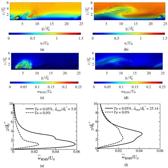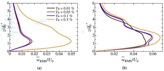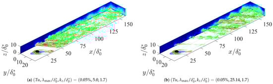 We have shown the peak-wavelength () dependence of the turbulent transition process via the CFV. Next, we discuss the dependence on the FST intensity. The CFV and its secondary instability were known to be accelerated by high FST intensity [24,25]. The current study will confirm that, even under conditions controlled by the peak wavelength, a strong FST should cause an earlier transition.