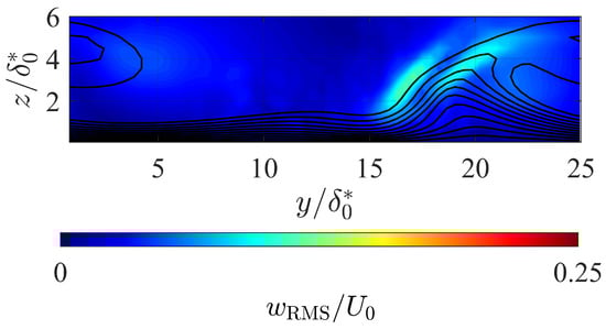 As for the finger vortex observed under the long- FST condition, we can identify its leg at in Figure 10b. Note here the spanwise periodicity of the domain. The positions of the finger vortex and its high region, as in (d), are at a side of low-speed region. This feature is in common with the secondary instability in the no-FST condition. Here, the contour of in the no-FST condition is plotted in Figure 11, for reference. A strong temporal disturbance due to the finger vortex can be detected at , which corresponds to a side of CFV. The three-dimensional visualization in Figure 4 also reveals the finger vortex extending from the side to the top of CFV. This vortex position corresponds to the location of the high-frequency secondary instability [13]. This type of high-frequency secondary instability that occurs at the side of CFV is classified as the z-mode (type-I) secondary instability [13,15,40]. However, a slightly different aspect is found in the profile, which is plotted in Figure 10f and shows a peak at higher than the hairpin vortex position. This position is the top of the CFV, so it is defined as the y-mode (type-) of the high-frequency secondary instability [13,15,40]. The weaker disturbances are also distributed at the side of CFV, as in Figure 10d, indicating coexistence of the z-mode. The position of the finger vortex was also shifted upstream significantly compared to the no-FST condition. Under long- FST conditions, as reported by Högberg and Henningson [12] and Downs and White [23], FST shifts not only the transition position, but also the secondary instability upstream (compared to the no-FST condition).