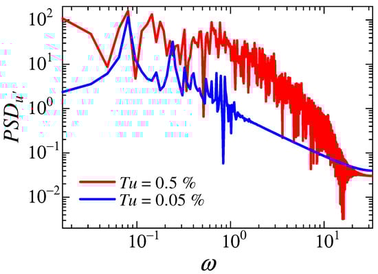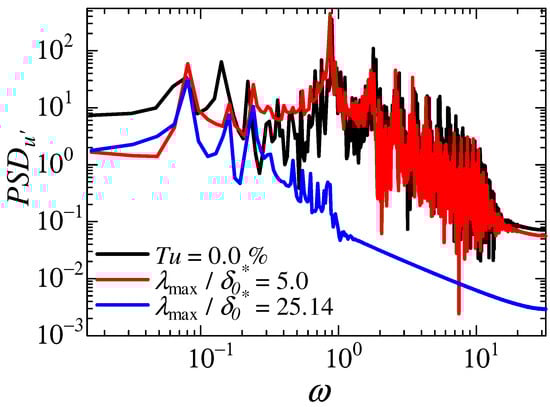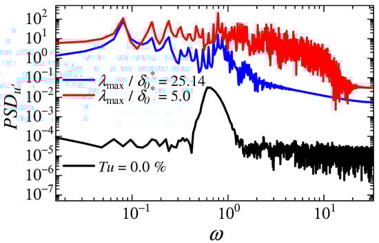We have shown that the FST wavelength alters a secondary vortex structure that triggers a turbulent transition, by visualizing the instantaneous flow field and the disturbance distribution. The short- FST corresponds to a higher-frequency fluctuation that approaches the boundary layer. To investigate the effect of inflowing FST, we performed a frequency analysis of the temporal disturbance, for roughness height . The measurement time period is (), and the sampling rate is . The result is shown in Figure 12. A peak at appears regardless of . This peak is attributed to the limited length of the disturbance box , and the disturbance box repeatedly inflows into the flow field. The inflow rate of the disturbance box was , which was . The wavelength is equivalent to the low-frequency disturbance of , and is the high-frequency disturbance . In particular, the high frequency is comparable to the high-frequency range tested by Högberg and Henningson [12]. The high-frequency range of is unstable on the CFV [10,30]. The high-frequency secondary instability that occurs during the development of the CFV is induced near the cylindrical roughness by the short- FST. It is the mechanism of the early transition process by the hairpin vortex.