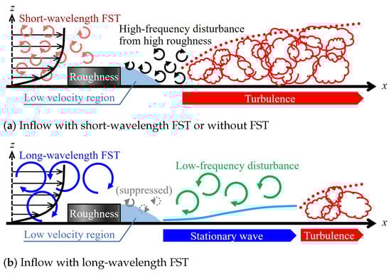 In order to determine a frequency at which the disturbance due to high roughness is suppressed, we performed the frequency analysis for , as shown in Figure 14. The method and sampling conditions are same with those for Figure 12. The measurement point is near the upper edge of the cylindrical roughness where the high-frequency disturbance occurs. Comparison with the no-FST condition shows a significant decrease in the high-frequency region of for the long- FST. The nominal frequency of long is . As a result, the flow with suppressed immediate transitions undergoes turbulent transitions far downstream due to low-frequency disturbances, as shown in Figure 13b. Figure 15 shows the schematics of immediate transition suppression mechanisms. The wavelength of the FST affects the roughness height threshold () of the immediate transition, via the suppression of high-frequency disturbance from the high roughness edge.