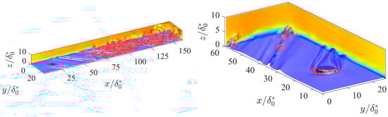 Existing studies on the effect of FST on CFV have mainly focused on the FST intensity, . Saric et al. [21] reported that a low leads to the primary mode, which is called the traveling CFV on the swept-flat-plate [6]. The primary mode grows downstream and deforms the mean flow. As amplitude increases, secondary instability is induced. This is a similar transition process due to the cylindrical roughness, except that CFV is traveling. As increases, the traveling mode becomes more dominant than the stationary mode of the CFV induced by the small roughness [6,22]. Even under low conditions in which the stationary CFV forms, its turbulent transition would be affected by the FST. Indeed, there is a wind-tunnel test reporting that the disturbance involved in the CFV is enhanced as increased [23]. The effect of FST was also studied numerically by Hosseini et al. [24]. They reported turbulent transitions rather upstream region of the flow field under high- conditions. The effect of both and on the turbulent transition process was studied recently [25]. Even at the same roughness height, the flow became turbulent immediately after roughness owing to the disturbance of FST, depending on its intensity. The interference of disturbances has also been analyzed by LES (large-eddy simulation). Huai et al. [26] performed LES under two different conditions of either steady or unsteady disturbance. They reported turbulent transitions due to secondary instabilities in the former condition, but the amplification of secondary instability was not observed under the latter condition. This is because LES could not resolved near-wall vortices and their interactions with the disturbance [27]. A recent high-order LES with finer grids can reproduce the mean velocity profile accurately even near walls, but the modelings of the kinetic energy profile and second instabilities are still problematic [28,29]. To study on FST-induced transitions, it is essential to employ DNS to resolve unsteady disturbance and near-wall fluctuations. Several DNS studies have focused on a wide range of FST intensities and revealed that even low- affects the flow field and the stationary CFV due to the roughness. However, since the turbulence generally has a broad wavelength range, there is a need to know the dependence on the wavelength involved in FST approaching the boundary layer.