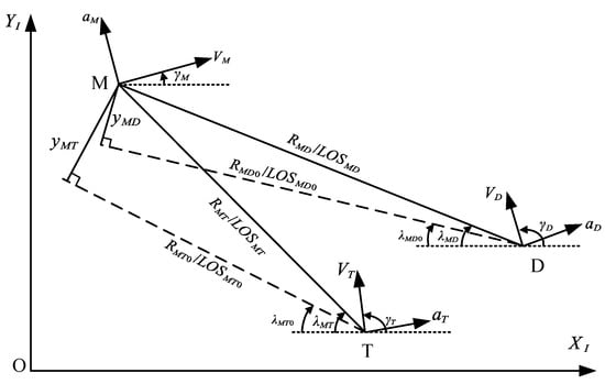 The TMD three-body engagement involves an offensive and defensive confrontation, including an attacking missile (M) on one side and a target (T) and a defender (D) on the other side. The mission of the missile is to attack the target, but the defender will be launched by the target or other platforms to intercept the missile, so the missile is required to evade the defender by maneuvering before attempting to hit the target. The mission of the target/defender is the opposite. In general, the target is weak in maneuvering and has difficulty avoiding being hit by the missile through traditional maneuvering strategies, so the target adopts an active defense strategy of firing the defender to intercept the missile and survive in the battlefield. The engagement geometry of the TMD three-body confrontation in the inertial coordinate system is shown in Figure 1.