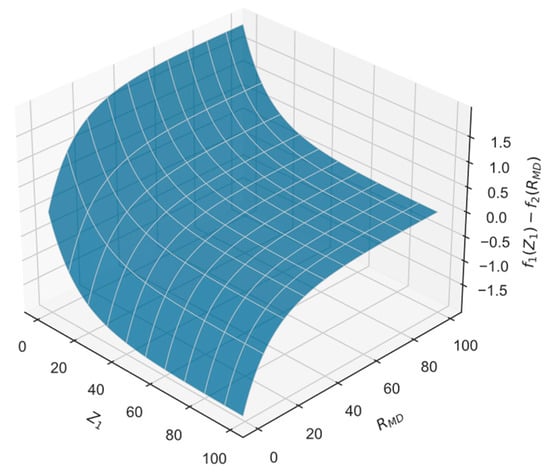 Using and , the first two terms of the reward function can be plotted as Figure 4. When the defender is far from the missile, the reward function encourages the missile to shorten its distance from the target. As decreases, the overall reward also decreases to become negative, which means that the penalty dominates, so the missile’s mission at this time is mainly to evade the defender. Furthermore, using , , , and , the agent will receive a decisive penalty when the defender is close to intercepting the missile.