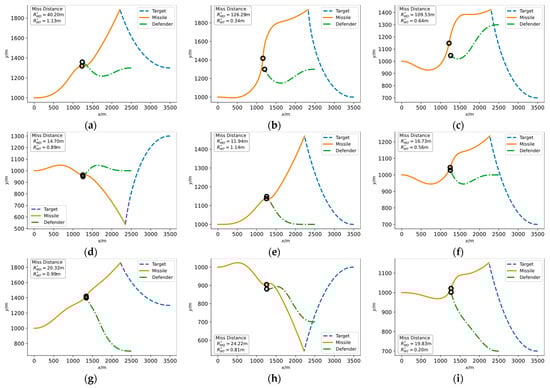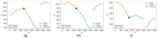 Engagement trajectories of assessing target/defender agent under different simulation conditions, i.e., different target longitudinal position and defender longitudinal position : (a) Longitudinal position , ; (b) Longitudinal position , ; (c) Longitudinal position , ; (d) Longitudinal position , ; (e) Longitudinal position , ; (f) Longitudinal position , ; (g) Longitudinal position , ; (h) Longitudinal position , ; and (i) Longitudinal position , .