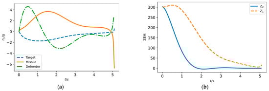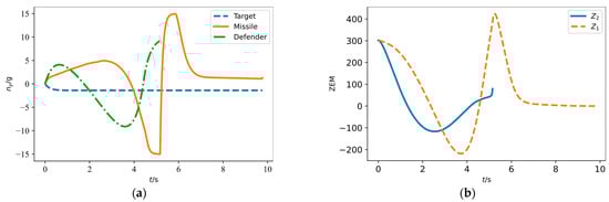 As shown in Figure 8, the missile does not maneuver to its maximum capability as the defender approaches and the timing of the maneuver lags and is eventually intercepted by the defender. Besides, the curves of the zero-effort miss show that the defender has locked the missile on the intercept triangle at about 2 s, while the missile is late in locking the target, which also reflects the failure of the missile attack strategy.