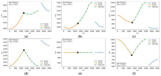 The simulation results for different engagement scenarios are illustrated in Figure 7. The missile utilizes the DRL-based intelligent attack strategy and the target/defender adopts the intelligent active defense strategy trained with the missile agent. In all scenarios, the defender successfully intercepts the missile. Unlike the missile facing a defender employing the proportional navigation guidance law, the missile in these cases does not adopt timely and effective maneuvers to evade the defender. The attack strategy of the missile agent, which is essentially a neural network, seems to be paralyzed. This suggests that the cooperative actions of the target/defender perform an effect similar to network adversarial attack, a widely noticed phenomenon in deep learning classifiers where the researcher can add a little noise to the network input thereby disabling the trained deep network [65,66].