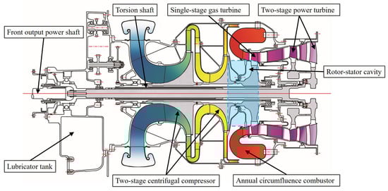 This study aimed at the swirl flow and heat transfer characteristics of the rotor-stator cavity in consideration of the thermal deformation of the inlet labyrinth seal. In the typical structure of turboshaft engines, as shown in Figure 1 [35], a labyrinth is installed between the outlet of the centrifugal compressor disk cavity and the inlet of the turbine disk cavity. The labyrinth is situated below the circumfluence combustor, metering the mass flow rate of the cooling air from the compressor outlet to the turbine disk cavity, which is used to cool the turbine disk and prevent gas from invading the disk cavity. However, the labyrinth seal at the inlet of the rotor-stator cavity experiences harsh thermal loads, which would lead to thermal deformation of the labyrinth seal and result in heat transfer degradation in the rotor-stator cavity.