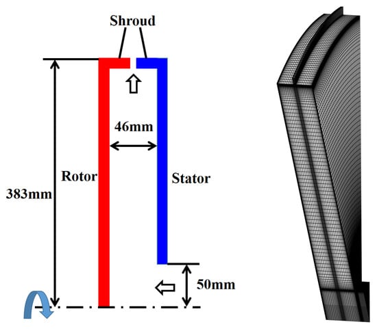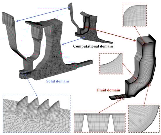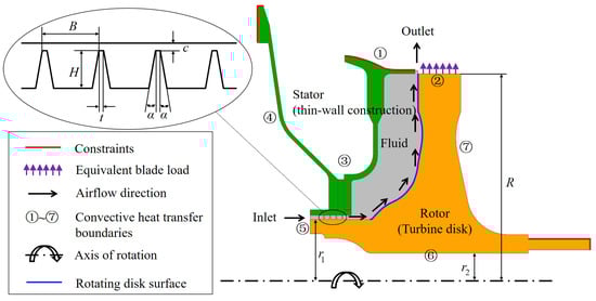 In this investigation, the body force of the air was ignored, and there was no internal heat source in the computing domain. The steady-state simulation (time-dependent analysis) was carried out numerically, so the time derivative terms in the above equations are all zero. In Equation (6), is the coupling term of the thermoelastic equation, reflecting the temperature change caused by elastic deformation. The thermoelastic coupling term of the turbine disk is a tiny amount compared to the heat transfer term, so the thermoelastic coupling effect was ignored in the solution process.