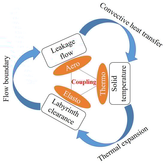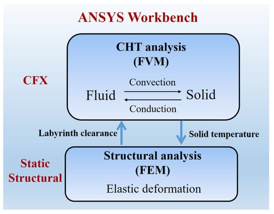 For the rotor-stator cavity and inlet labyrinth seal, there is a complex multi-physics coupling relationship among the labyrinth leakage flow, heat transfer in the disk cavity, solid conduction, and structural deformation, as shown in Figure 3. The labyrinth clearance is the flow boundary of leakage flow, which determines the mass flow rate, total temperature, and swirl ratio of cooling air in the disk cavity, thereby affecting the convective heat transfer of the turbine disk. The distribution of the solid temperature field is closely related to the heat transfer of the turbine disk, which will cause thermo-elastic deformation of the structure, and in turn, affect the labyrinth clearance. In order to accurately solve the two-way aero-thermo-elasto coupling relationship among leakage flow, convective heat transfer, solid heat conduction, and structural deformation, a computational strategy was developed by integrating conjugate heat transfer (CHT) analysis and structural finite element method (FEM) analysis under the platform of ANSYS Workbench (a commercial software), as shown in Figure 4. The CFX module simultaneously solves fluid convective heat transfer and solid heat conduction by finite volume method (FVM), realizing CHT analysis. The fluid field in the rotor-stator cavity and the temperature field of the rotor and the stator were evaluated by considering fluid-solid interaction. Moreover, the Static Structural module solves the structural elastic deformation by FEM, realizing structural deformation analysis. The radial displacements of the rotor and stator and, consequently, the new seal clearance profile were evaluated by considering the temperature distribution and the centrifugal load. The simulation was a non-linear analysis because the physical properties of the fluid and the solid are temperature dependent. The fluid was regarded as ideal air, which is a compressible fluid. The dynamic viscosity and thermal conductivity of the fluid were subject to the Sutherland formula in Appendix A. The effects of temperature on the thermal and mechanical properties of solid materials are considered in Appendix B.