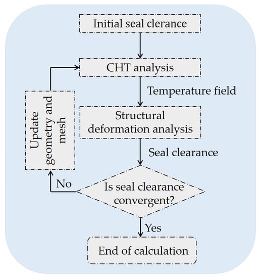 The solution process is shown in Figure 5. Solid temperature and labyrinth clearance were transferred between the two modules, and the solution was iteratively solved until the solution converged in terms of seal clearance. The seal clearance convergence criterion was the clearance difference between the two adjacent iterations and shall not exceed ±5 μm. Firstly, the labyrinth clearance was estimated, and the CHT analysis was carried out under the initial clearance. Then the solid temperature field was transferred to the FEM solver for structural deformation analysis. Finally, the calculated seal clearance was compared with the initial clearance. If the convergence criterion was satisfied, the calculation stopped; otherwise, the geometry and mesh were updated according to the new seal clearance, and then the next iteration cycle began.