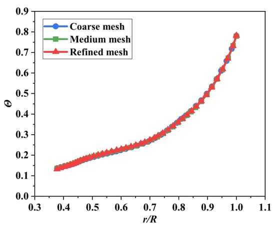 A grid sensitivity analysis was also performed to define the mesh size. Three sets of grids with different element numbers were established. The element numbers of coarse, medium, and refined meshes were 0.31 million, 0.62 million, and 1.20 million respectively. Computational convergence was accepted when the residuals of the continuity equation, momentum equation, and energy equation converge to the order of 2 × 10−6. Figure 7 shows the dimensionless metal temperature on the surface of the turbine disk under cruise state, in which the differences among coarse, medium, and fine grids are no more than 2.5%. The dimensionless metal temperature results can be considered independent from the mesh size. Considering the compromise between simulation accuracy and calculation cost, the medium grids were selected for subsequent calculation and analysis.