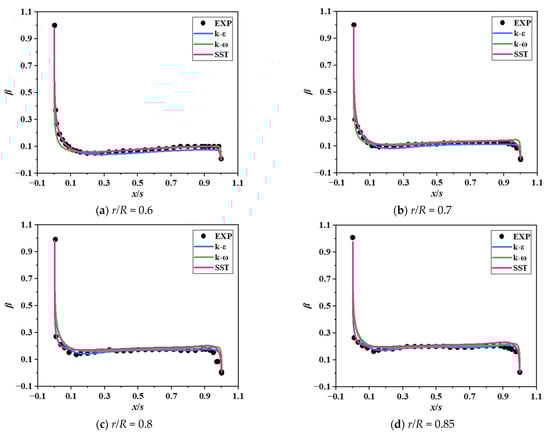 In Equation (A3), is a similar parameter including the influence of the main geometric parameters of the cascade, and Re is the Reynolds number at the exit of the turbine guide. In Equation (A4), and are flow angles of the vane cascade inlet and outlet, S is vane width, b is vane chord length, and t is vane pitch.