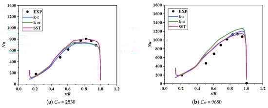 The numerical model was established, as shown in Figure 8. The simulation results were compared with the experiment data in Figure 9 and Figure 10. Three turbulent models (k-ε, k-ω, and SST) were examined in three sets of experiment cases (Cw = 2530, Cw = 6100, and Cw = 9680, in which Cw = ). Swirl ratios from different turbulent models were validated by experimental data in Figure 9. The SST model performed best, especially at the transition between the core region and near-wall region. Nusselt number distributions from all three turbulent models presented a similar tendency with the experiment data and are shown in Figure 10. The calculation results indicate that the numerical method in the present work can simulate the heat transfer in the rotor-stator cavity with reasonable accuracy. Generally, the SST model had a better performance for swirl flow and heat transfer simulation in the rotor-stator cavity. The SST model modified the definition of the eddy viscosity coefficient and considered the transmission effect of turbulent shear stress. Therefore, the SST model has higher accuracy and credibility in a wide range of flow fields, especially in near-wall free flow. Considering the above advantages, the SST model was used in the subsequent numerical simulation.