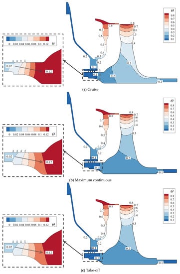 The solid temperature field calculation was the premise of the structural deformation analysis. Figure 11 shows the dimensionless metal temperature distributions in the cruise state, maximum continuous state, and take-off state. Generally, the temperatures of the labyrinth rotor and stator were close to the inlet total temperature of the cooling air, and dimensionless metal temperatures did not exceed 0.1. This is attributed to the strong heat exchange between the cooling air and the labyrinth seal structure. However, from the partially enlarged contour maps, it is clear that there was a temperature gradient along the axial direction of the rotor. The side closer to the turbine disk had a higher temperature, which would cause uneven thermal deformation.