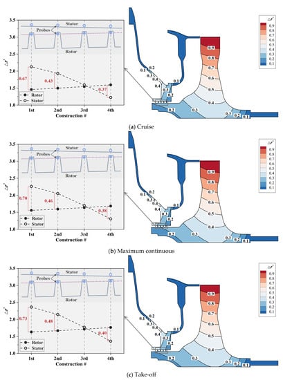 Figure 12 shows the contour maps of the dimensionless radial displacement. The radial deformations of both the rotor and the stator were not uniform in the axial direction. The radial displacement of the rotor close to the turbine disk was larger, while that of the stator away from the turbine disk was larger. The reasons for their uneven radial deformation were also different. The non-uniformity of the rotor was due to the axial temperature gradient, while the non-uniformity of the stator was due to the different structural stiffness of the front and rear sides. Figure 12 also displays the radial deformation of each labyrinth stage. Radial deformation comparison between the stator and rotor showed that: the former was larger than the latter for the first and second stages of the labyrinth, while the latter was larger than the former for the fourth stage of the labyrinth. For the third stage of the labyrinth, the radial deformation of the stator was similar to that of the rotor. As a result, the labyrinth clearance presented a convergent hot-running clearance (HC) profile. Owing to the non-uniform radial deformation, the non-uniformity deformations of the rotor and stator led to an obvious decrease in the minimum tip clearance. The minimum tip clearance was smaller than the CC by 37% for the cruise state, 38% for the maximum continuous state, and 40% for the take-off state. Therefore, the risk of collision and rub between the rotating and stationary parts may be underestimated during the aero-engine operation if the non-uniformity deformation of the labyrinth clearance is ignored.