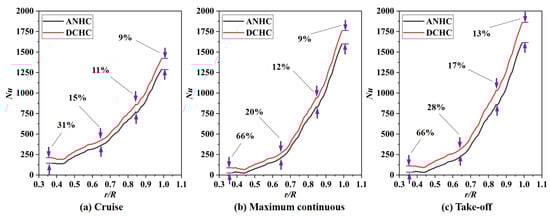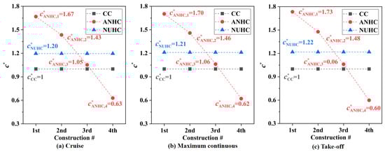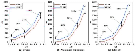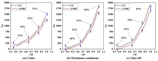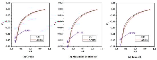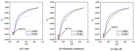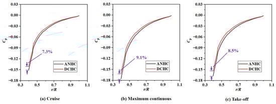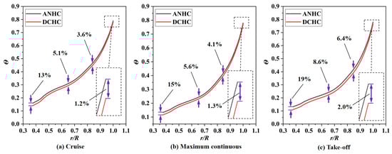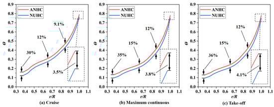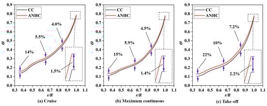 Pressure coefficient distributions of the rotating disk surface under CC and ANHC are compared in Figure 13. The pressure coefficient under the ANHC was smaller than those under the CC along the rotating disk surfaces. At the inlet of the rotor-stator cavity, the of ANHC was lower than that of the CC by 6.9%, 9.1%, and 8.9% in the cruise state, the maximum continuous state, and the take-off state, respectively. This is attributed to the inlet seal flow effects. The lower denotes a greater reverse pressure gradient along with the radial outflow, which means that non-uniformity deformation of the labyrinth clearance may increase the possibility of mainstream high-temperature gas ingress.