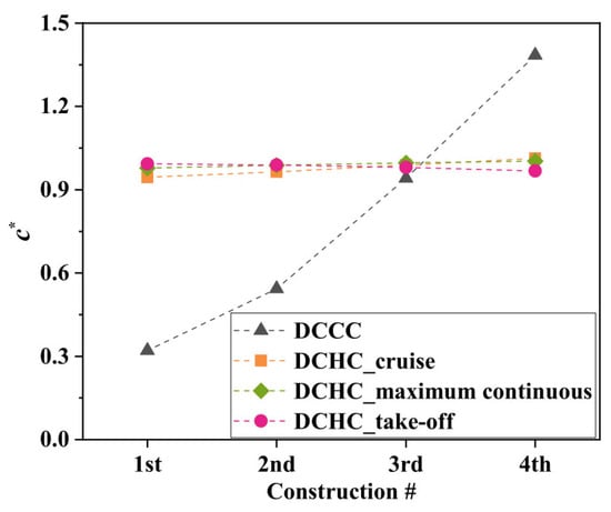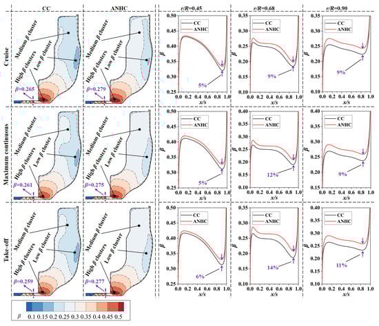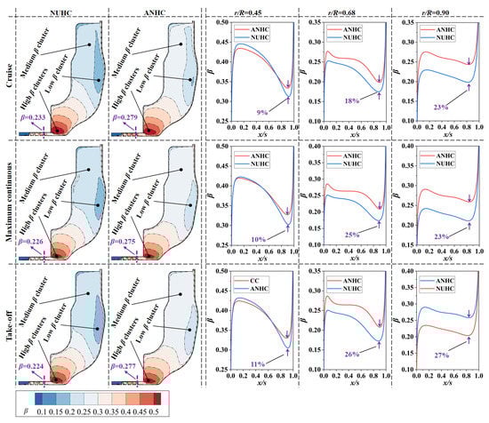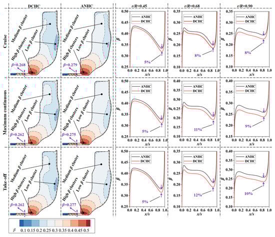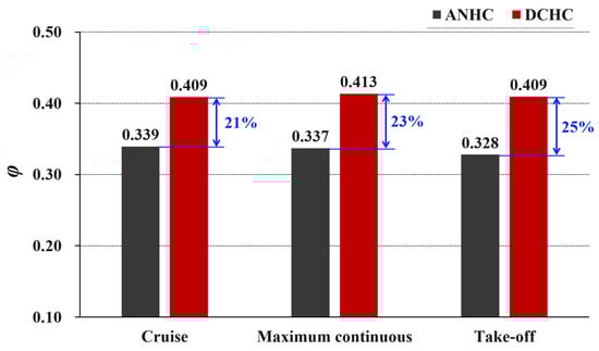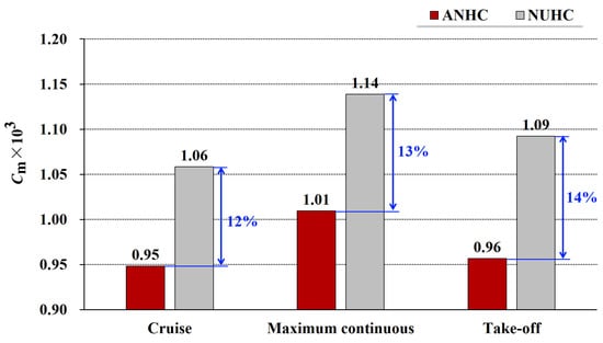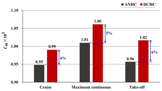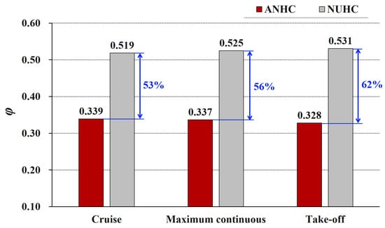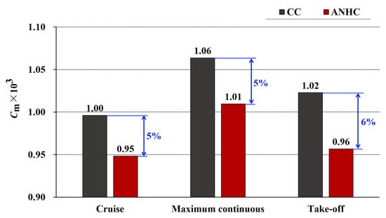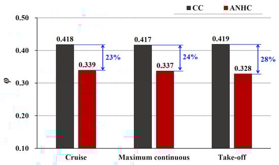 The mass flow rate of cooling air is closely related to the pressure distribution in the rotor-stator cavity. Figure 14 shows the flow coefficients of the rotor-stator cavity under CC and ANHC. Compared with the CC, the flow coefficient under the ANHC was reduced by 23–28% in the three states. This is because the minimum tip clearance of the ANHC is smaller than those of the CC (see Figure 12), which is the key factor determining the mass flow rate of cooling air.