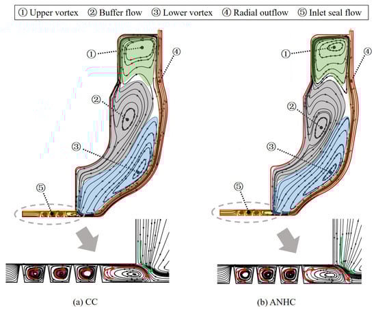 Despite the pressure coefficient and flow coefficient differences between CC and ANHC, flow structures in the rotor-stator cavity were similar, indicating that the flow structure is not sensitive to the inlet seal deformation effect. Taking cruise state as an example, flow structures under CC and ANHC are shown in Figure 15. Five zones can be approximately distinguished in the rotor-stator cavity, that is, the upper vortex at the high radius region of the cavity, the lower vortex at the low radius region of the cavity near the rotating disk, the buffer flow between the upper vortex and lower vortex, the radial outflow near the rotating wall, and the inlet seal flow in the labyrinth seal. The cooling air leaks from the inlet labyrinth seal, forming the through-flow in the rotor-stator cavity. Induced by the pump effect of the rotating disk, fluid near the rotating disk flows centrifugally. Fluid near the stationary disk flows centripetally and is transported to the radial outflow near the rotating disk by the upper vortex and lower vortex, supplementing the pumping flow. Since the rotating speed at the high radius region is larger than that at the low radius region, requirements for pumping flow supplement are not the same at different radii. Consequently, two swirling vortices, instead of a single one, occupy the high radius region and low radius region, respectively, between which the buffer flow becomes a transition area.