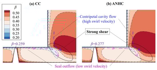 The swirl flow difference can be attributed to the effect of inlet seal thermal deformation. Figure 17 compares the swirl flow around the outlet of the labyrinth seal. The swirl velocity of seal outflow was much smaller than that of the centripetal cavity flow, resulting in a strong circumferential shear interaction at the entry of the rotor-stator cavity. Due to the non-uniform seal clearance effect, windage heating and swirl development characteristics inside the labyrinth seal [38] become different from that of the uniform seal clearance. Compared to CC, the swirl ratio of seal outflow under ANHC was higher, so the mixed airflow carried more swirl velocity into the disk cavity. The inlet labyrinth seal under ANHC was more favorable to transport swirl flow into the rotor-stator cavity. This explains why the high swirl ratio cluster expands and the low swirl ratio cluster shrinks in the condition of ANHC, as shown in Figure 16.