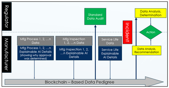 Another process has made considerable momentum with business, supply chain, and manufacturing use cases: blockchain [60]. While not immediately apparent to non-practitioners, blockchain has a number of unique attributes that can offer solutions for the limited digital thread of today, and the complete digital thread of the near future. One of the earliest blockchain use cases identified within manufacturing was for supply chain management [61,62]. The blockchain ledger’s immutability characteristic can vastly improve the proof-of-origin aspect necessary especially for high precision industries such as aerospace (particularly defense-based aerospace). This type of immutability, along with a cloud-based structure for data management and access privileges [63,64], can strengthen the digital thread’s ability to use data to create a faster certification cycle for innovative materials, products, and manufacturing processes. As digital thread data are captured, they can be hashed. This hash can be placed on a chain as a key to proving immutability for the data, and this process can be carried out as the data themselves are first created, whether along the supply chain, on the factory floor, or as the component is installed and in service. The ability to share these data with authorized partners, government auditors, and customers holds tremendous potential.