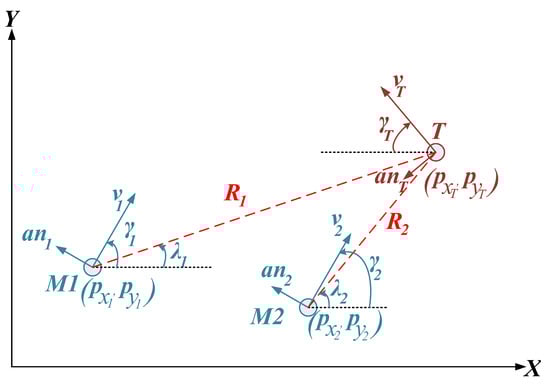 The planar engagement geometry of interceptors and one target was assumed as shown in Figure 1. Variables belonging to the target are indicated by T, while those belonging to the interceptors are indicated by . v, , , , and R represent speed, normal acceleration, heading, line-of-sight (LOS) angles, and the LOS range between the interceptor and target, respectively. It is important to note that the normal acceleration is perpendicular to the velocity. The positions along the X and Y axes are denoted by and , respectively. All angles are positive in the counterclockwise direction.