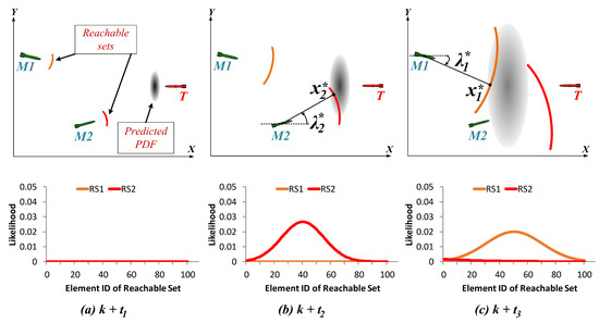 Illustration of reachable sets, corresponding likelihood, and pdf of predicted target state when time instants (a) , (b) , and (c) .
