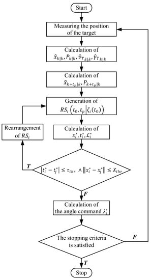 At the current time step, the difference between and is represented by and , respectively. Additionally, is a timing threshold, and is a distance threshold. In the case where , , the interceptors go to closer positions, and the coverage of the most-probable target positions decreases. To avoid this case, the reachable set of interceptors is rearranged by removing with the smallest likelihood from the corresponding reachable set. Then, , , and are recalculated until the condition, i.e., , is not valid. The flow diagram of the proposed cooperative guidance law is illustrated in Figure 3. The simulations were performed based on the flow.
