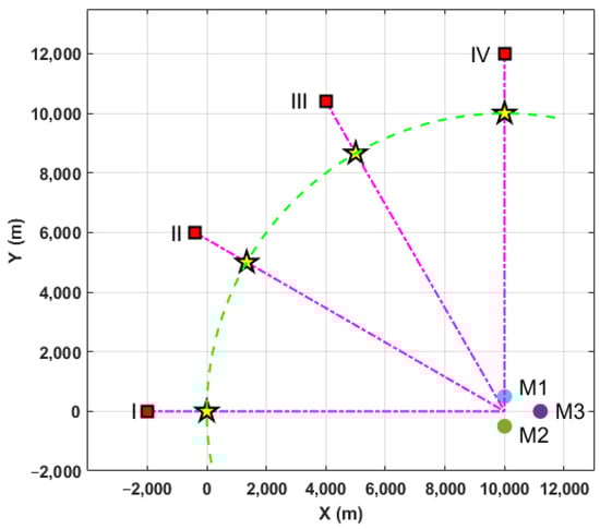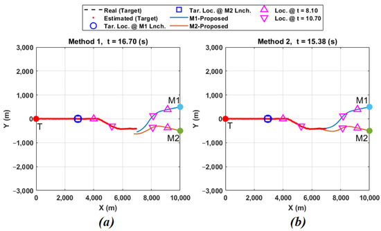 In Figure 9, an example of the trajectories using Method 1 and Method 2 is shown. In this figure, the blue circle and square denote the target’s position when M1 and M2 are launched, respectively. The upward-pointing and downward-pointing triangles represent the interceptors’ positions when the target exhibits a maneuver for the first and second time, respectively.