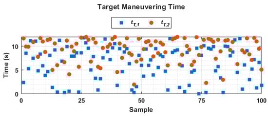 In this case, the initial target position was (−2000, 0) m and the heading angle was 180. Figure 5 represents the first, i.e., , and the second, i.e., , maneuver time steps, when for 100 samples.